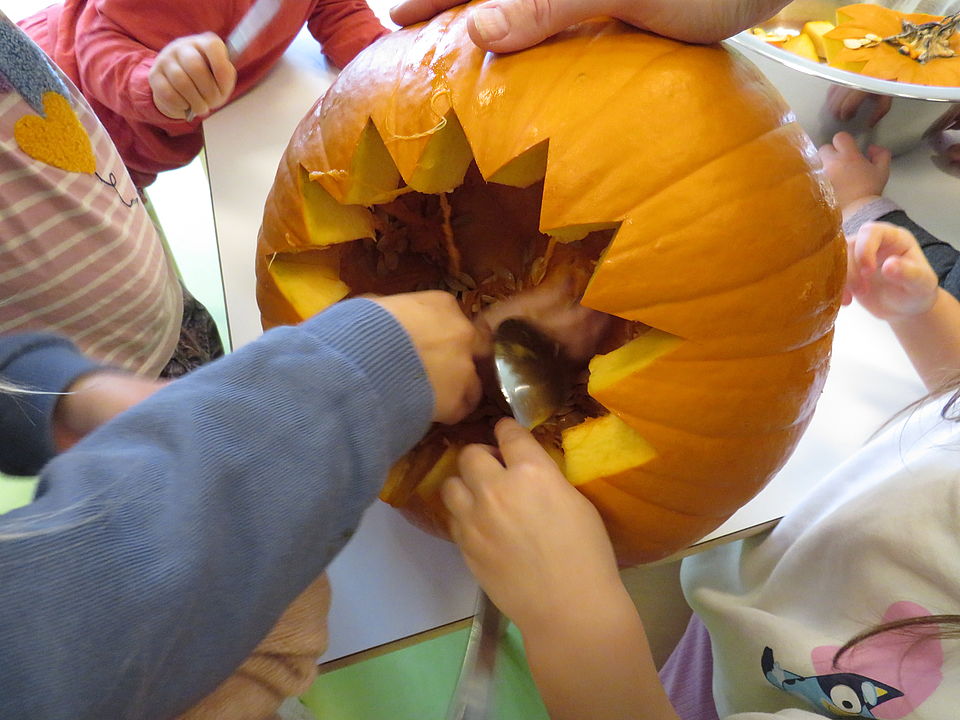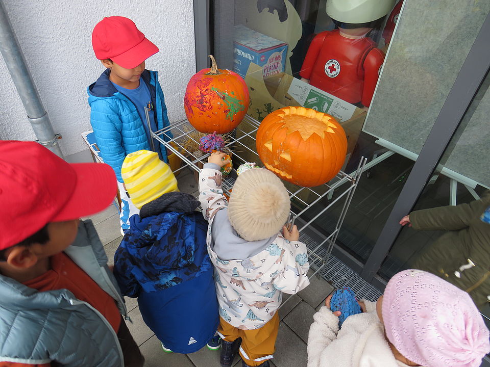 Passend zur Jahreszeit gestalteten die Kinder ihre eigenen Kürbisse: ausgehöhlt, bemalt und mit fröhlichen Gesichtern versehen. Nun schmücken sie unseren Eingangsbereich und bringen herbstliche Stimmung in die Kita.